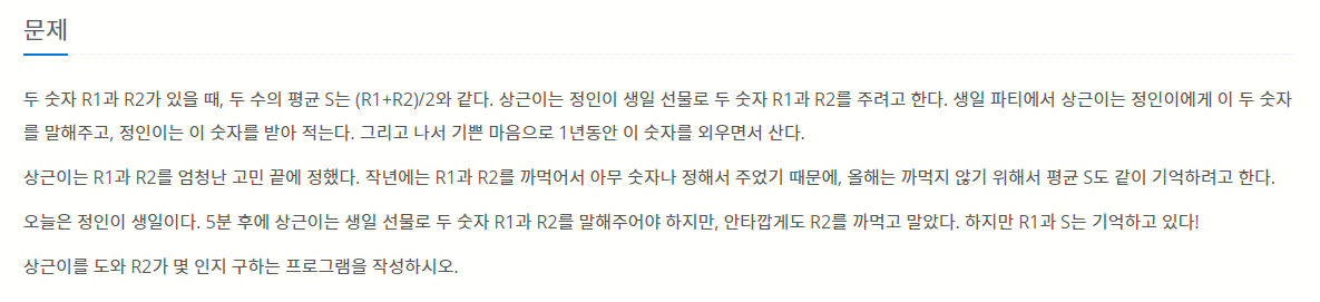 문제 두 숫자 R1과 R2가 있을 때, 두 수의 평균 S는 (R1+R2)/2와 같다. 상근이는 정인이 생일 선물로 두 숫자 R1과 R2를 주려고 한다. 생일 파티에서 상근이는 정인이에게 이 두 숫자를 말해주고, 정인이는 이 숫자를 받아 적는다. 그리고 나서 기쁜 마음으로 1년동안 이 숫자를 외우면서 산다. 상근이는 R1과 R2를 엄청난 고민 끝에 정했다. 작년에는 R1과 R2를 까먹어서 아무 숫자나 정해서 주었기 때문에, 올해는 까먹지 않기 위해서 평균