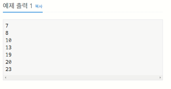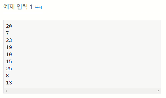 아홉 개의 줄에 걸쳐 난쟁이들의 키가 주어진다. 주어지는 키는 100을 넘지 않는 자연수이며, 아홉 난쟁이의 키는 모두 다르며, 가능한 정답이 여러 가지인 경우에는 아무거나 출력한다.