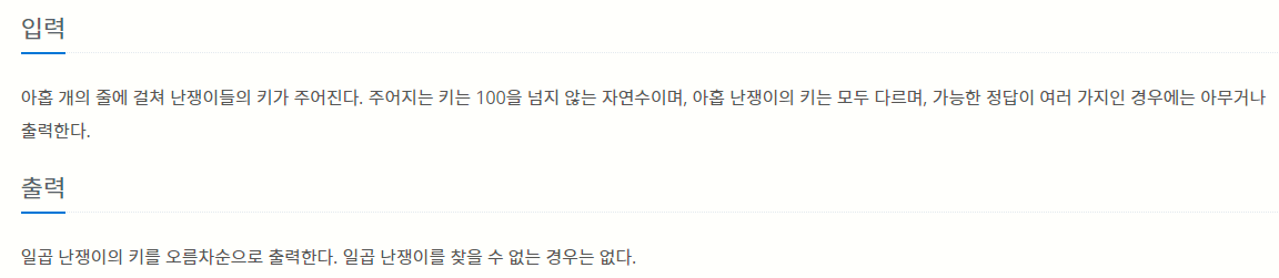 이 글에서 살펴볼 문제는 백준 2309번입니다.